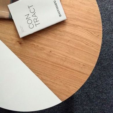 Отличительная особенность данного стола - это совмещение натуральности и практичности. Деревянная часть столешницы выполнена из ламельного дубового шпона с сучками и трещинками, что придает столу живости и неповторимости. Белый сектор изготовлен из металлического листа с прочной покраской, что позволяет разместить на нем чашку горячего кофе или чая.